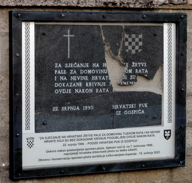 GOSPIĆRESTAURIRANA I ZAŠTIĆENA SPOMEN-PLOČAOtkrivena je obnovljena spomen-ploča na ogradnom zidu katoličkoga groblja u Gospiću. | |
